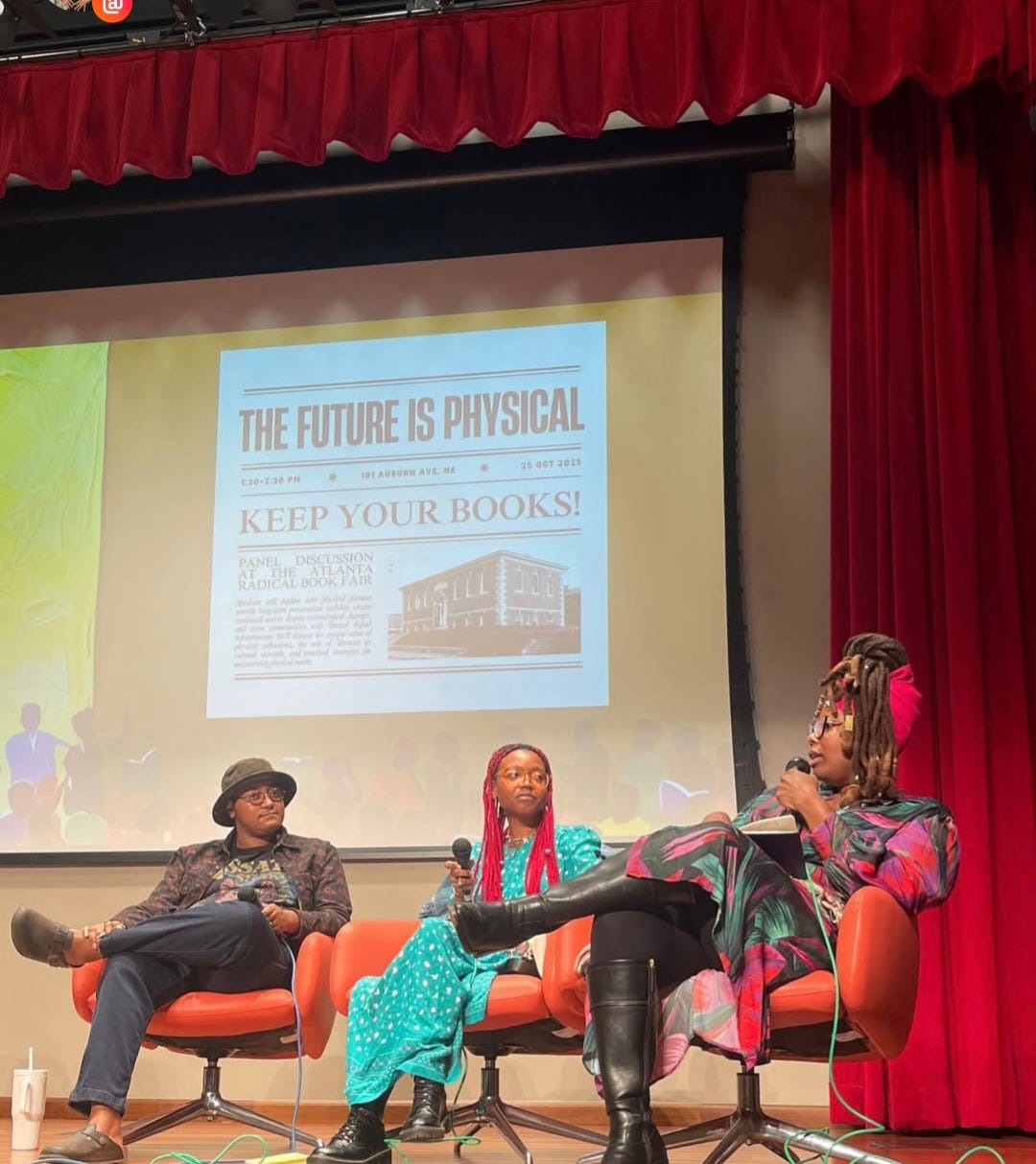 The Free Black Library had the opportunity to speak on “The Future is Physical” panel with Dr. Shady Radical, pictured to the right the founder of The Radical Archive Project (T.R.A.P) and Ashby Combahee, pictured to the left an archivist and librarian at the Highlander Research and Education Center and co-founder of Georgia Dusk, an oral history project.